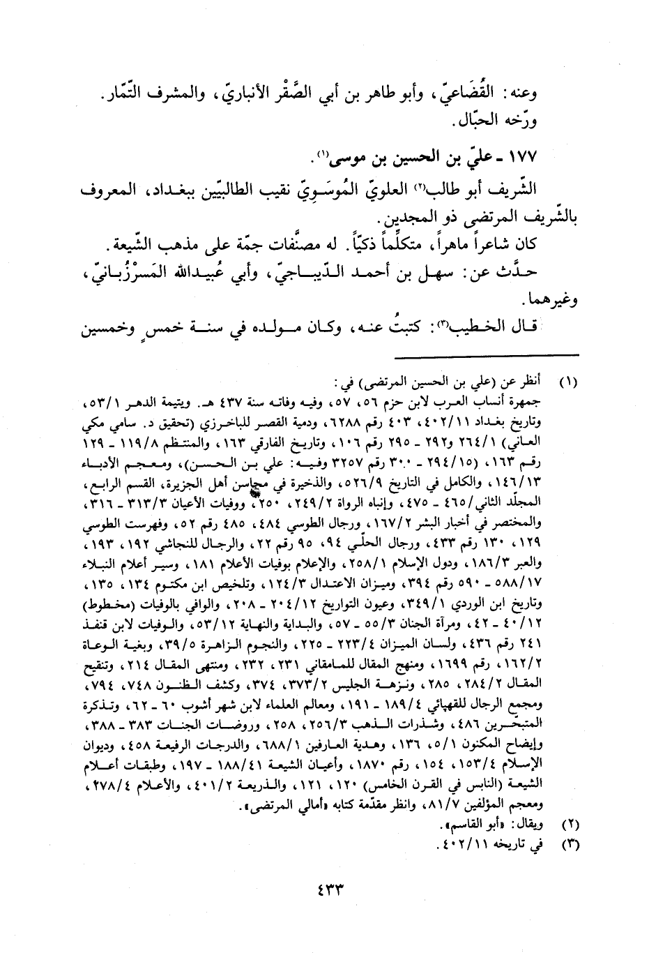 جمهرة أنساب العرب لابن حزم 56، 57، وفيه وفاته سنة 437 هـ. ويتيمة الدهر 1/ 53، وتاريخ بغداد 11/ 402، 403 رقم 6288، ودمية القصر للباخرزي (تحقيق د. سامي مكي العاني) 1/ 264 و 292- 295 رقم 106، وتاريخ الفارقيّ 163، والمنتظم 8/ 119- 129 رقم 163، (15/ 294- 300 رقم 3257 وفيه: علي بن الحسن) ، ومعجم الأدباء 13/ 146، والكامل في التاريخ 9/ 526، والذخيرة في محاسن أهل الجزيرة، القسم الرابع، المجلّد الثاني/ 465- 475، وإنباه الرواة 2/ 249، 250، ووفيات الأعيان 3/ 313- 316، والمختصر في أخبار البشر 2/ 167، ورجال الطوسي 484، 485 رقم 52، وفهرست الطوسي 129، 130 رقم 433، ورجال الحلّي 94، 95 رقم 22، والرجال للنجاشي 192، 193، والعبر 3/ 186، ودول الإسلام 1/ 258، والإعلام بوفيات الأعلام 181، وسير أعلام النبلاء 17/ 588- 590 رقم 394، وميزان الاعتدال 3/ 124، وتلخيص ابن مكتوم 134، 135، وتاريخ ابن الوردي 1/ 349، وعيون التواريخ 12/ 204- 208، والوافي بالوفيات (مخطوط) 12/ 40- 42، ومرآة الجنان 3/ 55- 57، والبداية والنهاية 12/ 53، والوفيات لابن قنفذ 241 رقم 436، ولسان الميزان 4/ 223- 225، والنجوم الزاهرة 5/ 39، وبغية الوعاة 2/ 162، رقم 1699، ومنهج المقال للمامقاني 231، 232، ومنتهى المقال 214، وتنقيح المقال 2/ 284، 285، ونزهة الجليس 2/ 373، 374، وكشف الظنون 748، 794، ومجمع الرجال للقهپائي 4/ 189- 191، ومعالم العلماء لابن شهرآشوب 60- 62، وتذكرة المتبحّرين 486، وشذرات الذهب 3/ 256، 258، وروضات الجنات 383- 388، وإيضاح المكنون 1/ 5، 136، وهدية العارفين 1/ 688، والدرجات الرفيعة 458، وديوان الإسلام 4/ 153، 154، رقم 1870، وأعيان الشيعة 41/ 188- 197، وطبقات أعلام الشيعة (النابس في القرن الخامس) 120، 121، والذريعة 2/ 401، والأعلام 4/ 278، ومعجم المؤلفين 7/ 81، وانظر مقدّمة كتابه «أمالي المرتضى» .