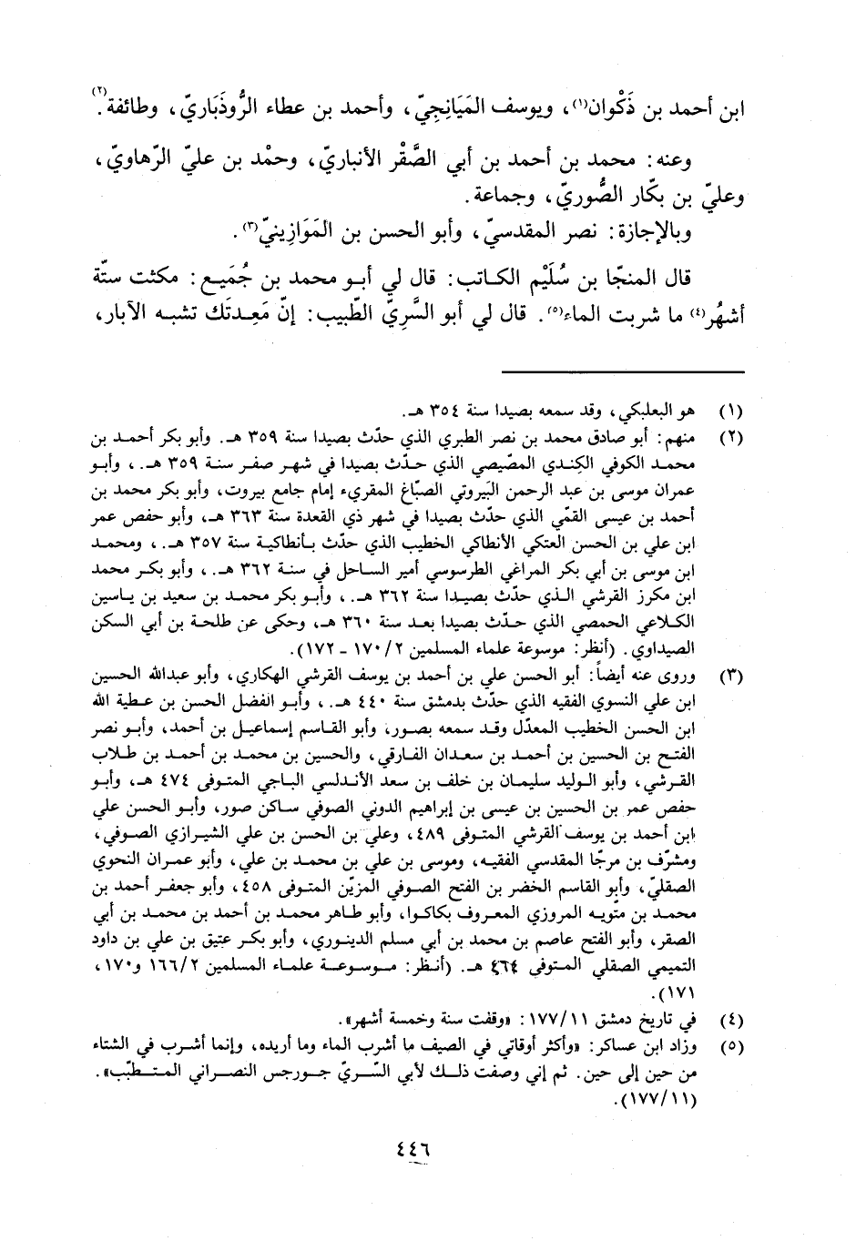 [2] منهم: أبو صادق محمد بن نصر الطبري الّذي حدّث بصيداء سنة 359 هـ. وأبو بكر أحمد بن محمد الكوفي الكندي المصّيصي الّذي حدّث بصيداء في شهر صفر سنة 359 هـ.، وأبو عمران موسى بن عبد الرحمن البيروتي الصبّاغ المقرئ إمام جامع بيروت، وأبو بكر محمد بن أحمد بن عيسى القمّي الّذي حدّث بصيداء في شهر ذي القعدة سنة 363 هـ، وأبو حفص عمر ابن علي بن الحسن العتكيّ الأنطاكي الخطيب الّذي حدّث بأنطاكيّة سنة 357 هـ.، ومحمد ابن موسى بن أبي بكر المراغي الطرسوسي أمير الساحل في سنة 362 هـ.، وأبو بكر محمد ابن مكرز القرشي الّذي حدّث بصيداء سنة 362 هـ.، وأبو بكر محمد بن سعيد بن ياسين الكلاعي الحمصي الّذي حدّث بصيداء بعد سنة 360 هـ، وحكى عن طلحة بن أبي السكن الصيداوي. (انظر: موسوعة علماء المسلمين 2/ 170- 172) .