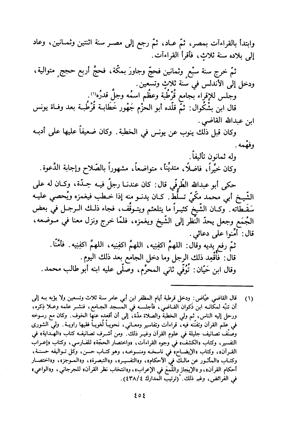 [1] قال القاضي عيّاض: ودخل قرطبة أيّام المظفر ابن أبي عامر سنة ثلاث وتسعين ولا يؤبه به إلى أن تنبّه لمكانه ابن ذكوان القاضي، فأجلسه في المسجد الجامع، فنشر علمه وعلا ذكره، ورحل إليه الناس، ثم ولي الخطبة والصلاة مدّة، إلى أن أقعده عنها الخوف. وكان مع رسوخه في علم القرآن وتفنّنه فيه، قراءات وتفاسير ومعاني، نحويا لغويا فقيها راويه. ولي الشورى وصنّف تصانيف جليلة في علوم القرآن وغير ذلك. ومن أشرف تصانيفه كتاب «الهداية» في التفسير، وكتاب «الكشف» في وجوه القراءات، «واختصار الحجّة» للفارسي، وكتاب «إعراب القرآن» ، وكتاب «الإيضاح» في ناسخه ومنسوخه، وهو كتاب حسن، وكل تواليفه حسنة، وكتاب «المأثور عن مالك في الأحكام» ، و «التفسير» ، و «التبصرة» ، و «الموجز» ، و «اختصار أحكام القرآن» ، و «الإيجاز واللمع في الإعراب» ، و «انتخاب نظر القرآن» للجرجاني، و «الواعي» في الفرائض، وغير ذلك. (ترتيب المدارك 4/ 438) .