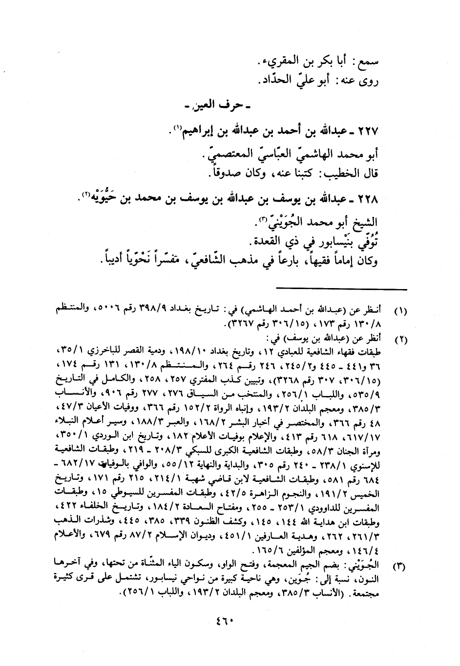 [3] الجويني: بضم الجيم المعجمة، وفتح الواو، وسكون الياء المثنّاة من تحتها، وفي آخرها النون، نسبة إلى: جوين، وهي ناحية كبيرة من نواحي نيسابور، تشتمل على قرى كثيرة مجتمعة. (الأنساب 3/ 385، ومعجم البلدان 2/ 193، واللباب 1/ 256) .