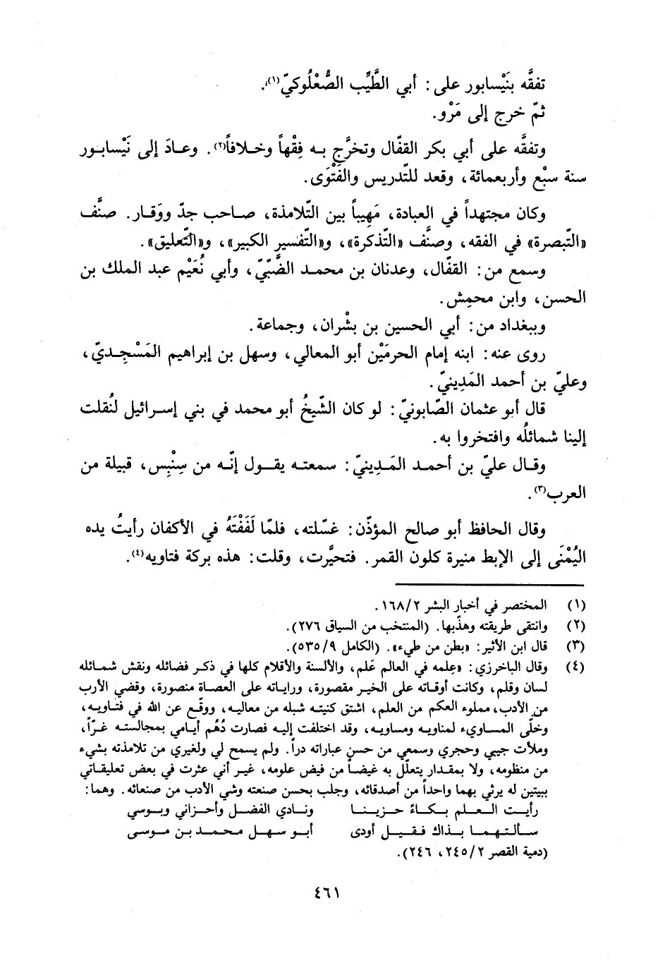 تفقّه بنَيْسابور على: أبي الطّيّب الصُّعْلُوكيّ [1] .
