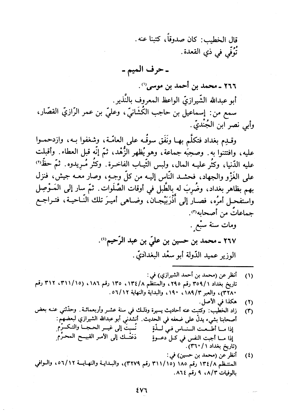 [3] زاد الخطيب: وكتبت عنه أحاديث يسيرة وذلك في سنة عشر وأربعمائة. وحدّثني عنه بعض أصحابنا بشيء يدلّ على ضعفه في الحديث. أنشدني أبو عبد الله الشيرازي لبعضهم: