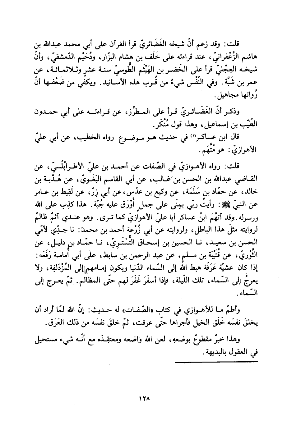 قلتُ: رَوَاهُ الأَهْوَازِيُّ فِي الصِّفَاتِ عَنْ أَحْمَدَ بْنِ عَلِيِّ الأَطْرَابُلُسِيِّ، عَنِ الْقَاضِي عَبْدِ اللَّهِ بْنِ الْحَسَنِ بْنِ غَالِبٍ، عَنْ أَبِي الْقَاسِمِ الْبَغَوِيِّ، عَنْ هُدْبَةَ بْنِ خَالِدٍ، عَنْ حَمَّادِ بْنِ سَلَمَةَ، عَنْ وَكِيعِ بْنِ عُدُسٍ، عَنْ أَبِي زِرٍّ، عَنْ لَقِيطِ بْنِ عَامِرٍ عَنِ النَّبِيِّ صَلَّى اللَّهُ عَلَيْهِ وَسَلَّمَ: رَأَيْتُ رَبِّي بِمِنًى عَلَى جَمَلٍ أَوْرَقَ عَلَيْهِ جُبَّةٌ. هَذَا كَذِبٌ عَلَى اللَّهِ وَرَسُولِهِ. وَقَدِ اتَّهَمَ ابْنُ عَسَاكِرَ أَبَا عَلِيٍّ الأَهْوَازِيَّ كَمَا تَرَى. وَهُوَ عِنْدِي آثِمٌ ظَالِمٌ لِرِوَايَتِهِ مِثْلُ هَذَا الْبَاطِلِ، وَلِرِوَايَتِهِ عَنْ أَبِي زُرْعَةَ أَحْمَدَ بْنِ مُحَمَّدٍ: نا جَدِّي لِأُمِّي الْحَسَنُ بْنُ سَعِيدٍ، نا الْحُسَيْنُ بْنُ إِسْحَاقَ التَّسَتُّريُّ، نا حَمَّادُ بْنُ دَلِيلٍ، عَنِ الثَّوْرِيِّ، عَنْ قُتَيْبَةَ بْنِ مُسْلِمٍ، عَنْ عَبْدِ الرَّحْمَنِ بْنِ سَابِطٍ، عَلَى أَبِي أُمَامَةَ رَفَعَهُ: