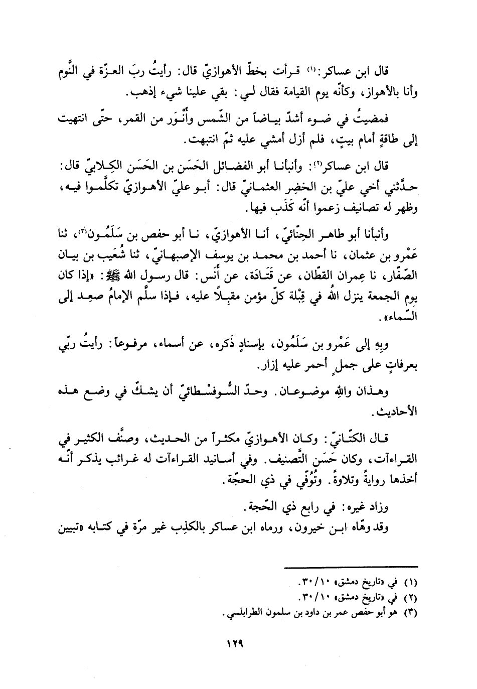 قال ابن عساكر: [1] قرأت بخطِّ الأهوازيّ قال: رأيت رب العزّة في النّوم وأنا بالَأهواز، وكأنّه يوم القيامة فقال لي: بقي علينا شيء اذهب.