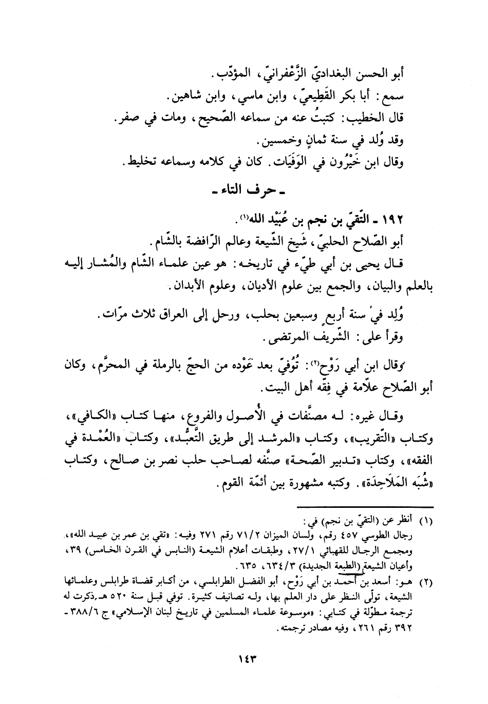 [2] هو: أسعد بن أحمد بن أبي روح، أبو الفضل الطرابلسي، من أكابر قضاة طرابلس وعلمائها الشيعة، تولّى النظر على دار العلم بها، وله تصانيف كثيرة. توفي قبل سنة 520 هـ. ذكرت له ترجمة مطوّلة في كتابي: «موسوعة علماء المسلمين في تاريخ لبنان الإسلامي» ج 6/ 388- 392 رقم 261، وفيه مصادر ترجمته.