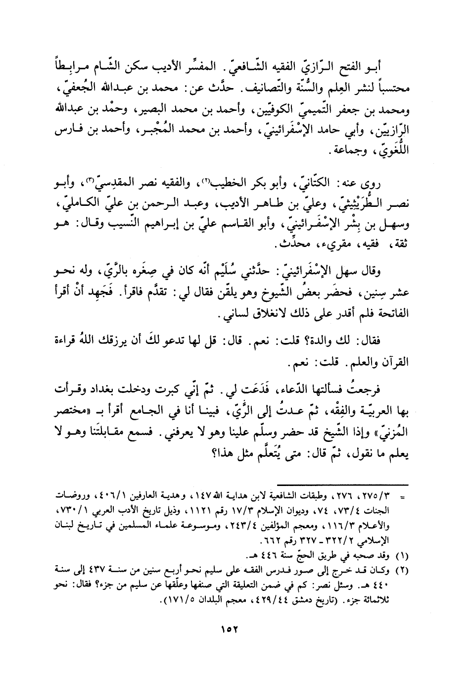 فرجعت فسألتها الدُّعاء، فَدَعَت لي. ثُمَّ إني كبرت ودخلت بغداد وقرأت بها العربية والفِقْه، ثُمَّ عُدت إلى الرّيّ، فبينا أنا في الجامع أقرأ ب «مُختَصَر المُزنيّ» وإذا الشّيخ قد حضر وسلَّم علينا وهو لَا يعرفني. فسمع مُقابلتنا وهو لَا يعلم ما نقول، ثُمَّ قال: متى يُتَعلَّم مثل هذا؟