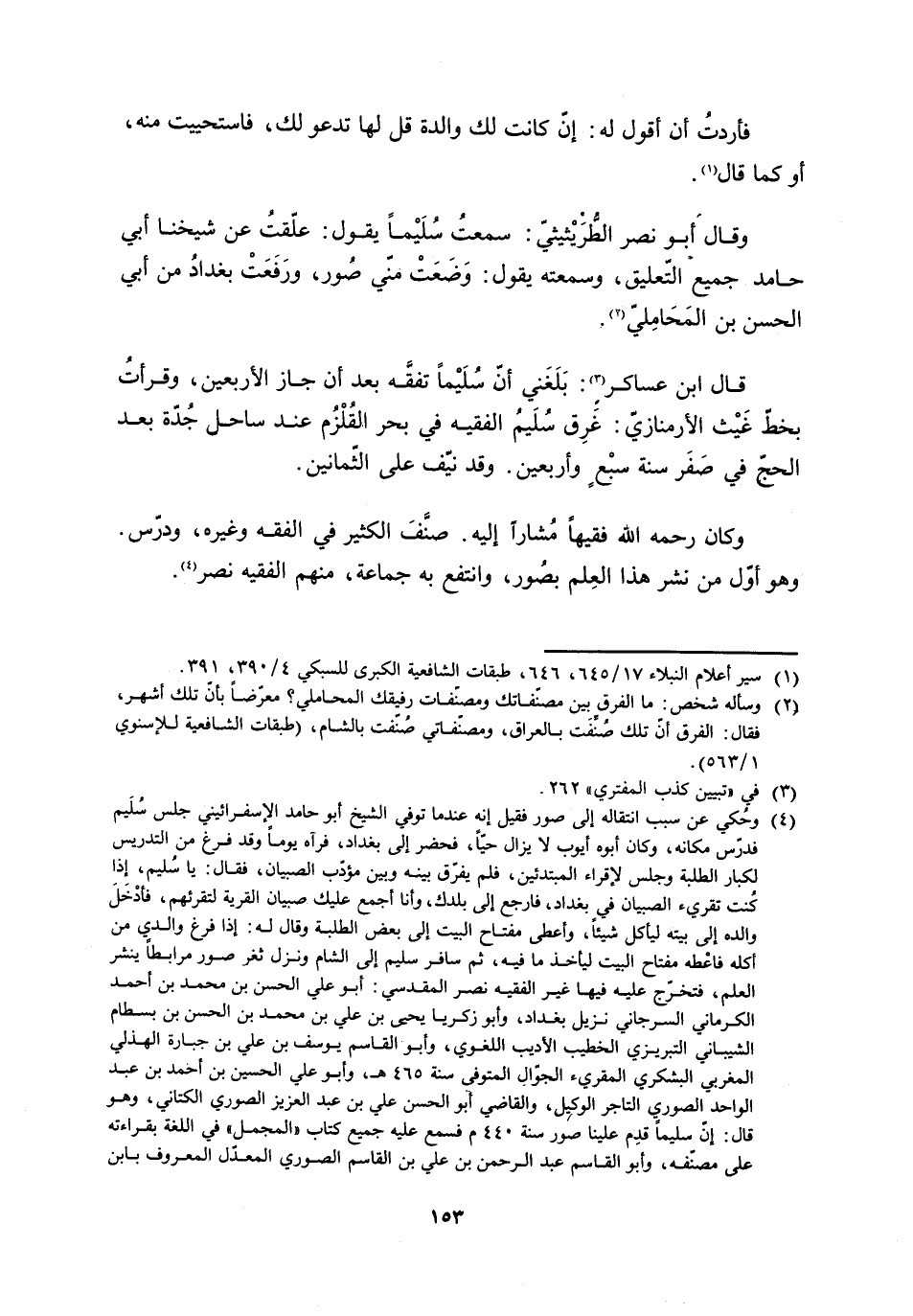 وقال أبو نصر الطُّرَيثِيثيِّ: سمعتُ سُلَيْمًا يقول: علَّقتُ عن شيخنا أبي حامد جميع التّعليق، وسمعته يقول: وَضَعَتْ منِّي صُور، ورفعت بغداد من أبي الحسن بن المَحَامليّ [2] .