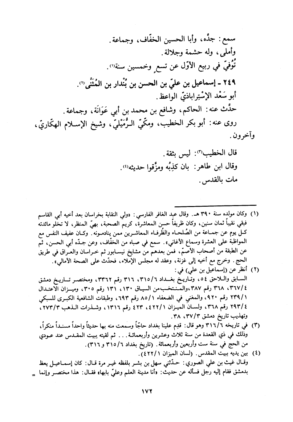 [3] في تاريخه 6/ 316 وهو قال: قدم علينا بغداد حاجّا وسمعت منه بها حديثا واحدا مسندا منكرا، وذلك في ذي القعدة من سنة ثلاث وعشرين وأربعمائة ... ثم لقيته ببيت المقدس عند عودي من الحج في سنة ست وأربعين وأربعمائة. (تاريخ بغداد 6/ 315 و 316) .