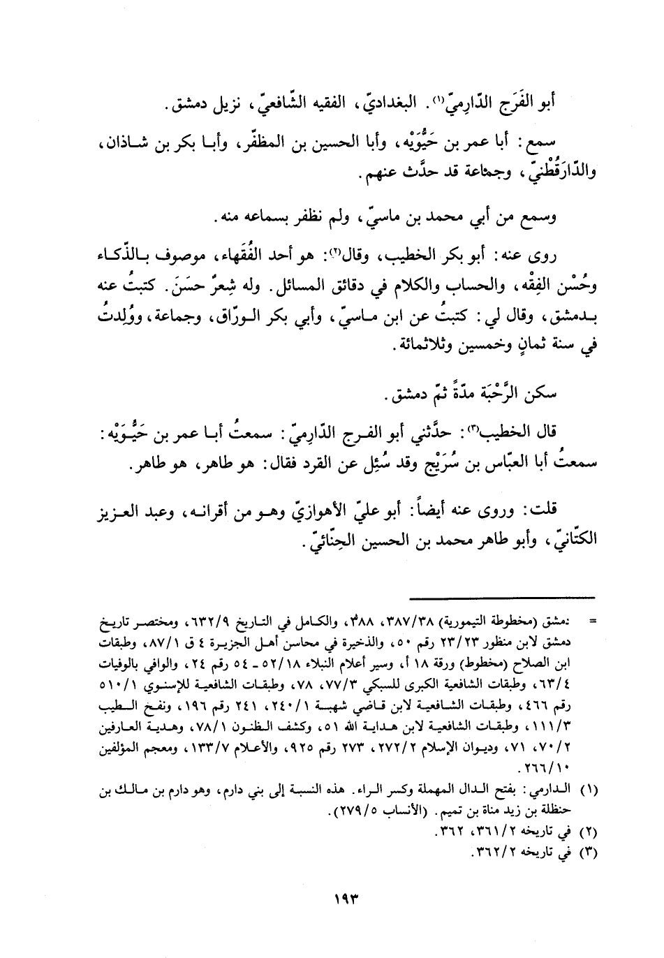 أبو الفَرَج الدّارِميّ [1] . البغداديّ، الفقيه الشافعيّ، نزيل دمشق.