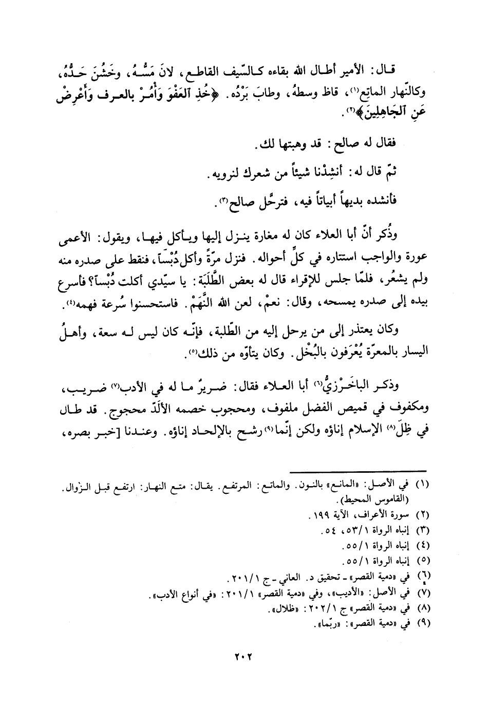 قال: الأمير أطال اللَّه بقاءه كالسّيف القاطع، لانَ مسُّهُ، وخشُنَ حدُّهُ، وكالنّهار الماتِع [1] ، قاظ وسطهُ، وطاب بَرْدُهُ. خُذِ الْعَفْوَ وَأْمُرْ بِالْعُرْفِ وَأَعْرِضْ عَنِ الْجاهِلِينَ 7: 199 [2] .
