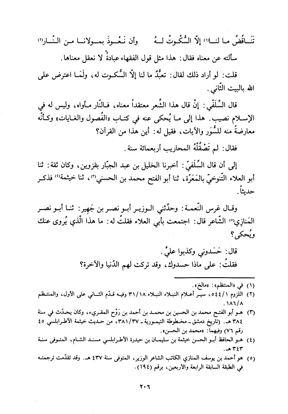 إلى أن قال السِّلفيّ: أخبرنا الخليل بن عبد الجبَّار بقزوين، وكان ثِقة: ثنا أبو العلاء التَّنوخيّ بالمَعَرَّة، ثنا أبو الفتح محمد بن الحسنيّ [3] ، ثنا خيثمة [4] فذكر حديثًا.