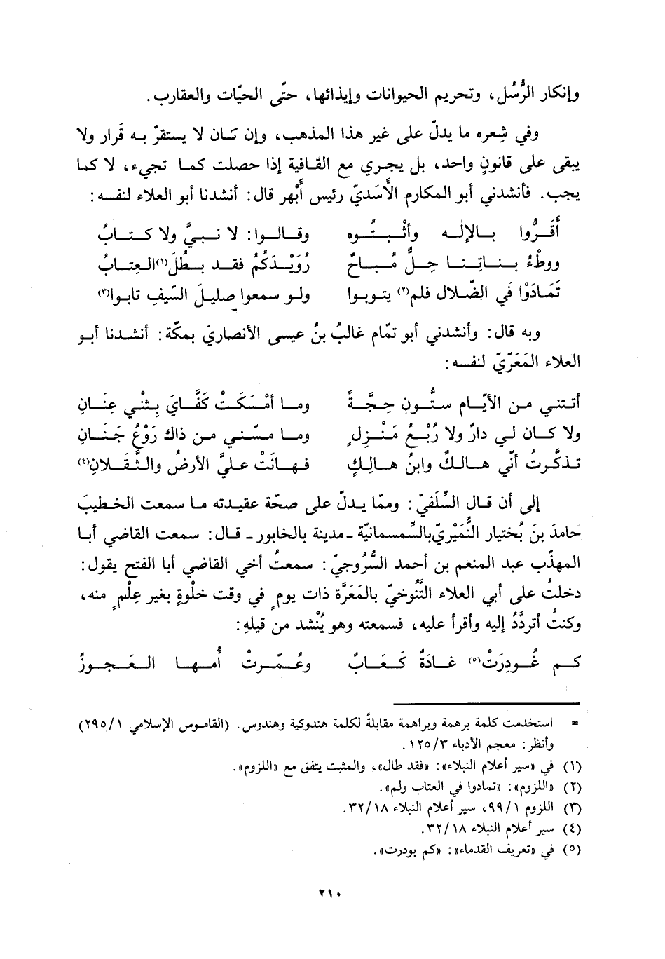 وفي شِعره ما يدُل على غير هذا المذهب، وإن كان لَا يستقر به قرار ولا يبقى على قانونٍ واحد، بل يجري مع القافية إذا حصلت كما تجيء، لَا كما يجب. فأنشدني أبو المكارم الأَسَديّ رئيس أَبْهَر قال: أنشدنا أبو العلاء لنفسه: