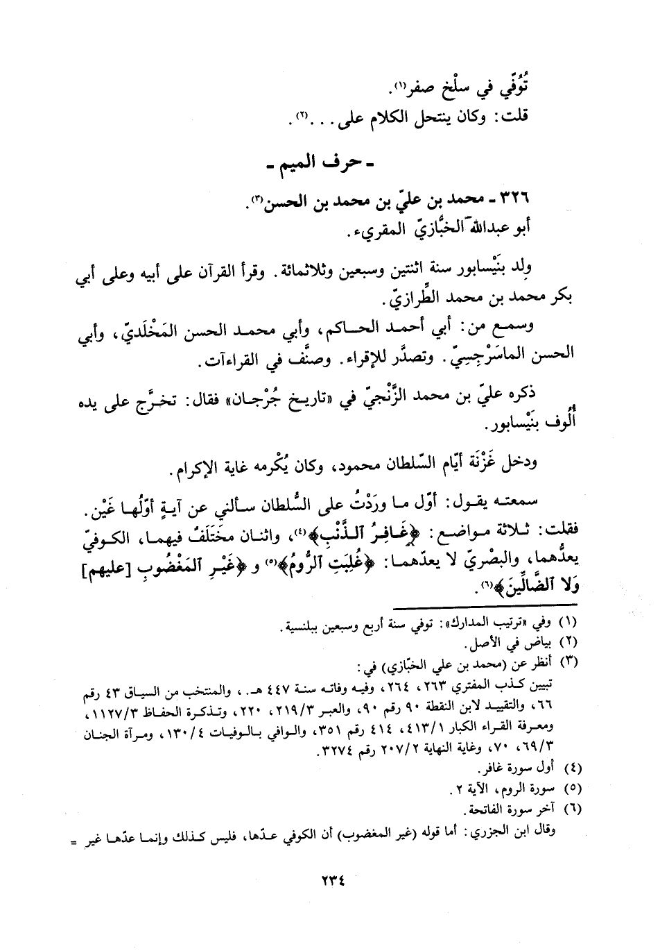 فقلت: ثلاثة مواضع: غافِرِ الذَّنْبِ 40: 3 [4] ، واثنان مُخْتَلَفٌ فيهما، الكوفيّ يعدُّهما، والبَصْريّ لَا يعدّهما: غُلِبَتِ الرُّومُ 30: 2 [5] وغَيْرِ الْمَغْضُوبِ [عَلَيْهِمْ] وَلَا الضَّالِّينَ 1: 7 [6] .