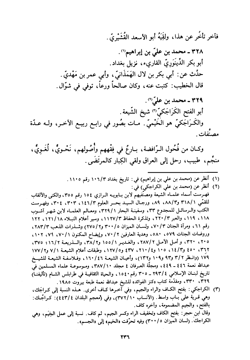 [3] الكراجكي: بفتح الكاف والراء والجيم، وفي آخرها كاف أخرى. هذه النسبة إلى كراجك، وهي قرية على باب واسط. (الأنساب 10/ 372) ، وفي (معجم البلدان 4/ 443) : كراجك: