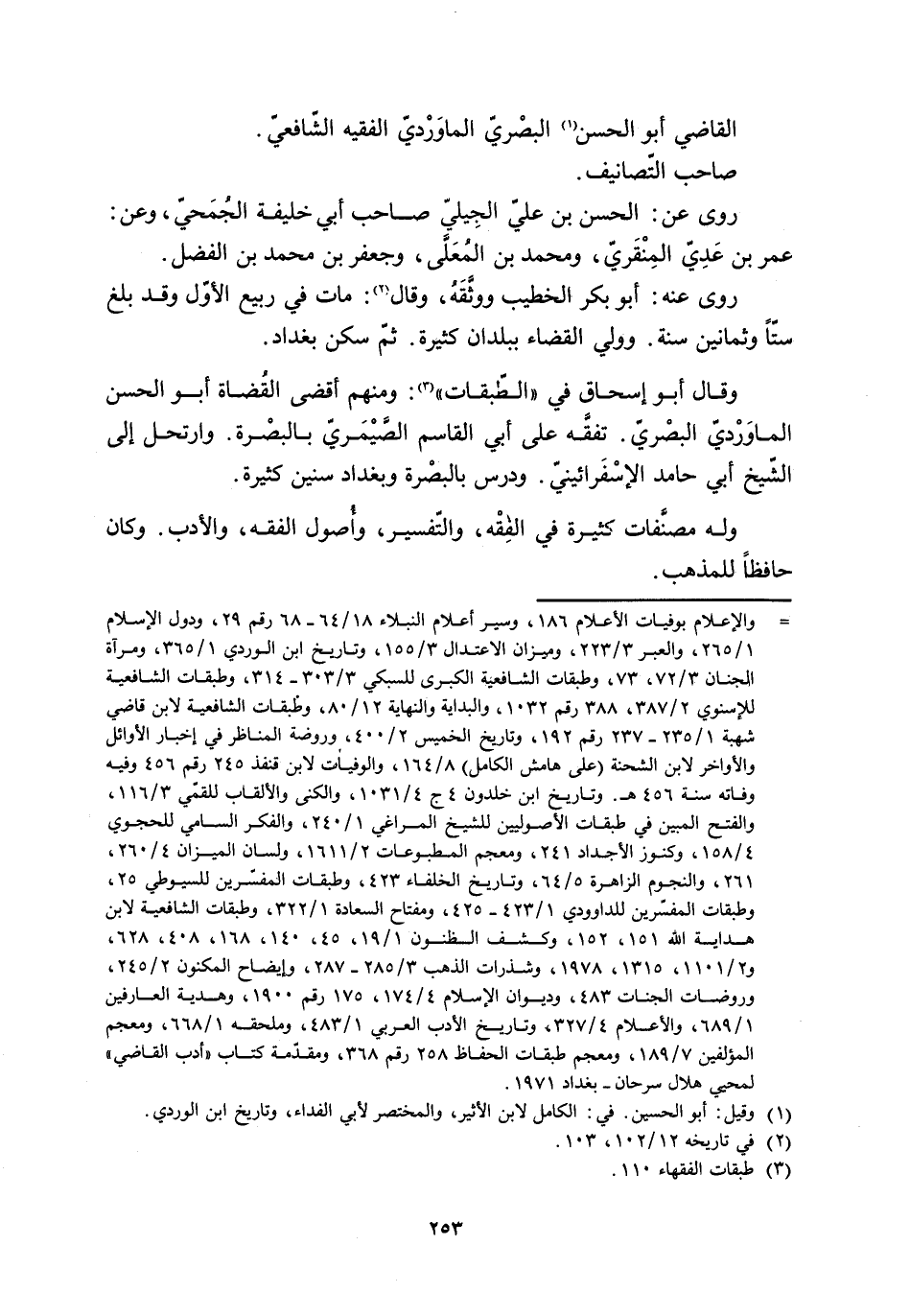 [ (-) ] والإعلام بوفيات الأعلام 186، وسير أعلام النبلاء 18/ 64- 68 رقم 29، ودول الإسلام 1/ 265، والعبر 3/ 223، وميزان الاعتدال 3/ 155، وتاريخ ابن الوردي 1/ 365، ومرآة الجنان 3/ 72، 73، وطبقات الشافعية الكبرى للسبكي 3/ 303- 314، وطبقات الشافعية للإسنويّ 2/ 387، 388 رقم 1032، والبداية والنهاية 12/ 80، وطبقات الشافعية لابن قاضي شهبة 1/ 235- 237 رقم 192، وتاريخ الخميس 2/ 400، وروضة المناظر في إخبار الأوائل والأواخر لابن الشحنة (على هامش الكامل) 8/ 164، والوفيات لابن قنفذ 245 رقم 456 وفيه وفاته سنة 456 هـ. وتاريخ ابن خلدون 4 ج 4/ 1031، والكنى والألقاب للقمّي 3/ 116، والفتح المبين في طبقات الأصوليين للشيخ المراغي 1/ 240، والفكر السامي للحجوي 4/ 158، وكنوز الأجداد 241، ومعجم المطبوعات 2/ 1611، ولسان الميزان 4/ 260، 261، والنجوم الزاهرة 5/ 64، وتاريخ الخلفاء 423، وطبقات المفسّرين للسيوطي 25، وطبقات المفسّرين للداوديّ 1/ 423- 425، ومفتاح السعادة 1/ 322، وطبقات الشافعية لابن هداية الله 151، 152، وكشف الظنون 1/ 19، 45، 140، 168، 408، 628، و 2/ 1101، 1315، 1978، وشذرات الذهب 3/ 285- 287، وإيضاح المكنون 2/ 245، وروضات الجنات 483، وديوان الإسلام 4/ 174، 175 رقم 1900، وهدية العارفين 1/ 689، والأعلام 4/ 327، وتاريخ الأدب العربيّ 1/ 483، وملحقه 1/ 668، ومعجم المؤلفين 7/ 189، ومعجم طبقات الحفاظ 258 رقم 368، ومقدّمة كتاب «أدب القاضي» لمحيي هلال سرحان- بغداد 1971.