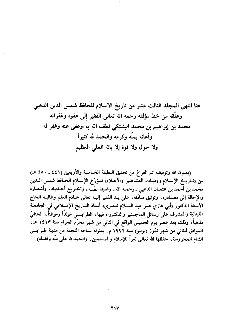 هنا انتهى المجلد الثالث عشر من تاريخ الإسلام للحافظ شمس الدين الذهبي وعلّقه من خط مؤلفه رحمه الله تعالى الفقير إلى عفوه وغفرانه محمد بن إبراهيم بن محمد البشتكي لطف الله به وعفى عنه وغفر له وأعانه بمنّه وكرمه والحمد للَّه كثيرا ولا حول ولا قوّة إلا باللَّه العليّ العظيم (بعون الله وتوفيقه تم الفراغ من تحقيق الطبقة الخامسة والأربعين (441- 450 هـ) من «تاريخ الإسلام ووفيات المشاهير والأعلام» لمؤرّخ الإسلام الحافظ شمس الدين محمد بن أحمد بن عثمان الذهبي- رحمه الله- وضبط نصّه، وتخريج أحاديثه، وأشعاره والإحالة إلى مصادره، وتوثيق مادّته، على يد الفقير إليه تعالى خادم العلم وطالبه الحاج الأستاذ الدكتور «أبي غازي عمر عبد السلام تدمري» أستاذ التاريخ الإسلامي في الجامعة اللبنانية والمشرف على رسائل الماجستير والدكتوراه فيها، الطرابلسي مولدا وموطنا، الحنفيّ مذهبا، وذلك بعد عصر يوم الخميس الواقع في الثاني من شهر محرّم الحرام سنة 1413 هـ.