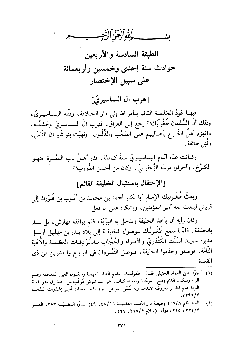 فيها عَوْد الخليفة القائم بأمر اللَّه إلى دار الخلافة، وقتله البساسيريّ، وذلك أنّ السُّلطان طُغْرلْبَك [1] رجع إلى العراق، فهرب آَلُ البساسيريّ وحَشَمُهُ، وانْهَزَمَ أَهْلُ الكَرْخ بأهاليهم على الصَّعْب والذَّلُول. ونَهَبَتْ بَنو شَيْبان النّاس، وقُتِل طائفة.