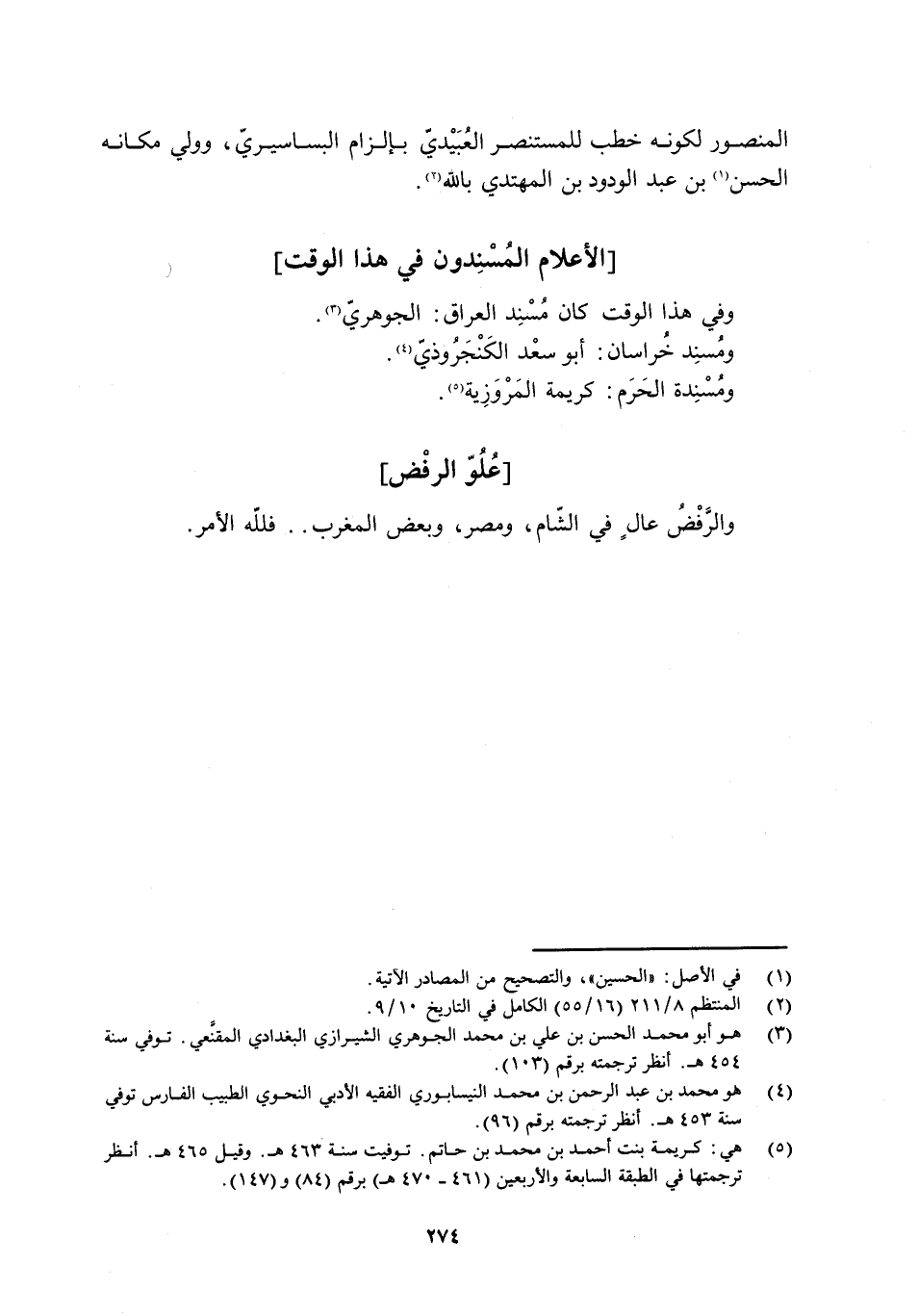 [5] هي: كريمة بنت أحمد بن محمد بن حاتم. توفيت سنة 463 هـ. وقيل 465 هـ. انظر ترجمتها في الطبقة السابعة والأربعين (461- 470 هـ) برقم (84) و (147) .