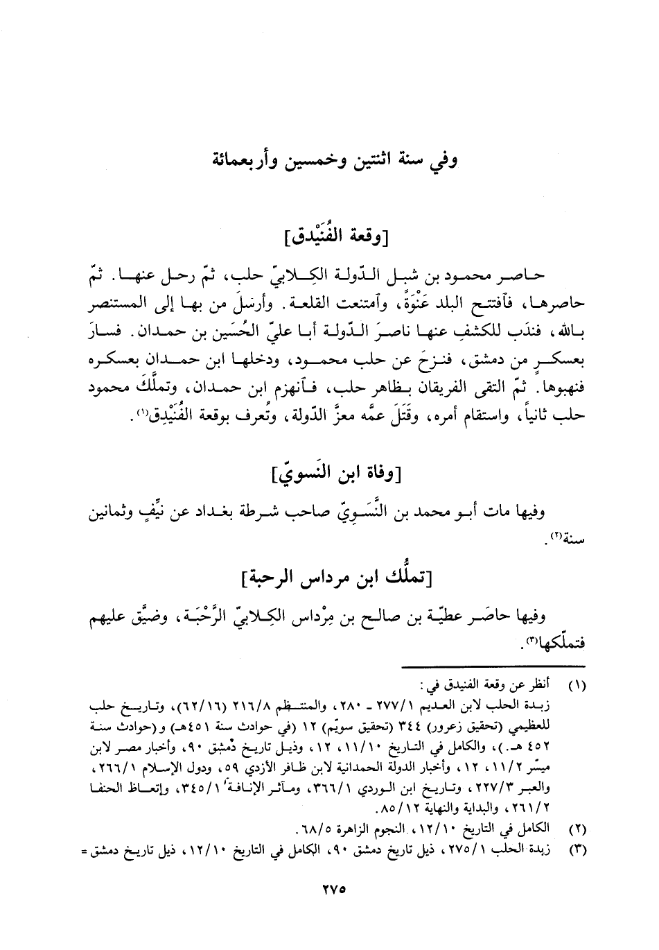 [3] زبدة الحلب 1/ 275، ذيل تاريخ دمشق 90، الكامل في التاريخ 10/ 12، ذيل تاريخ دمشق-
