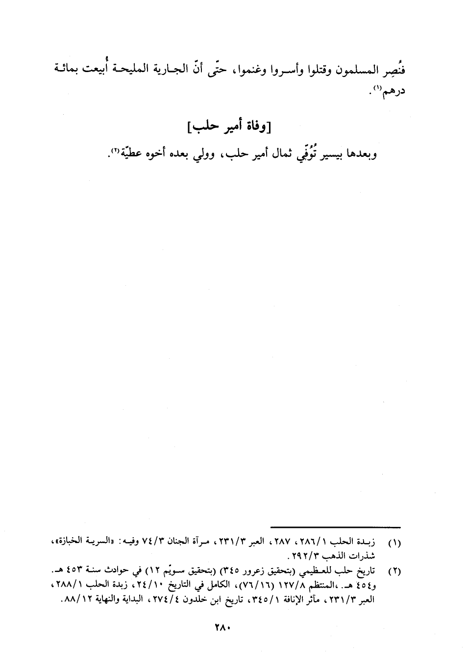 [2] تاريخ حلب للعظيميّ (بتحقيق زعرور 345) (بتحقيق سويّم 12) في حوادث سنة 453 هـ.