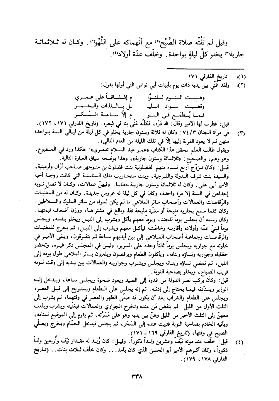 وقيل لم تَفُتْه صلاة الصُّبح [1] مع انهماكه على اللهو [2] . وكان له ثلاثمائة جارية [3] يخلو كلّ ليلة بواحدة. وخلَّف عِدّة أولاد [4] .