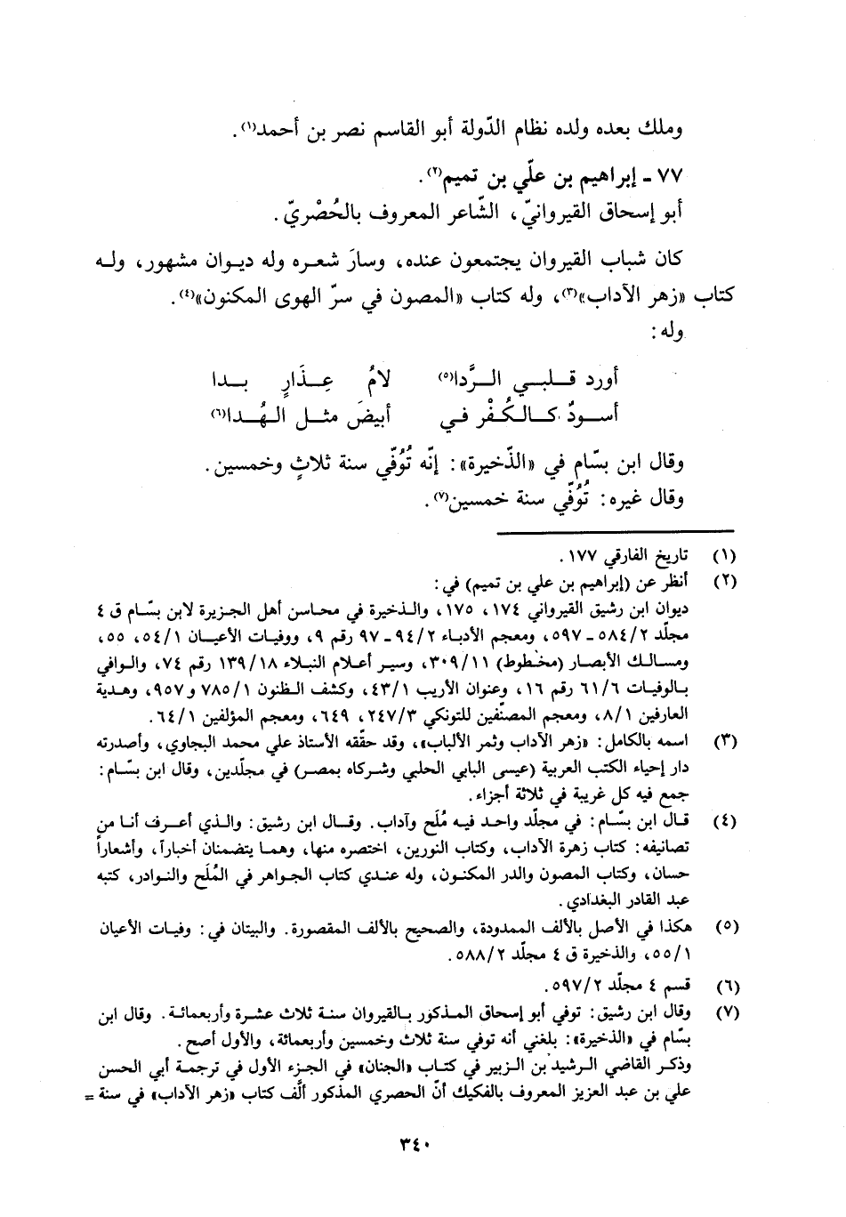 [3] اسمه بالكامل: «زهر الآداب وثمر الألباب» ، وقد حقّقه الأستاذ علي محمد البجاوي، وأصدرته دار إحياء الكتب العربية (عيسى البابي الحلبي وشركاه بمصر) في مجلّدين، وقال ابن بسّام: