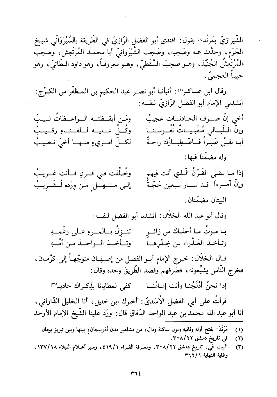 الشِّيرازيّ بِمَرَنْد [1] يقول: اقتدى أبو الفضل الرّازيّ في الطّريقة بالسَّيْرَوَانيّ شيخ الحرم، وحدَّث عنه وصحبه، وصحب الشّيروانيّ أبا محمد المُرتعِش، وصحب المُرْتَعِشُ الْجُنيد، وهو صحب السَّقطيّ، وهو معروفًا، وهو داود الطائيّ، وهو حبيبًا العجميّ.