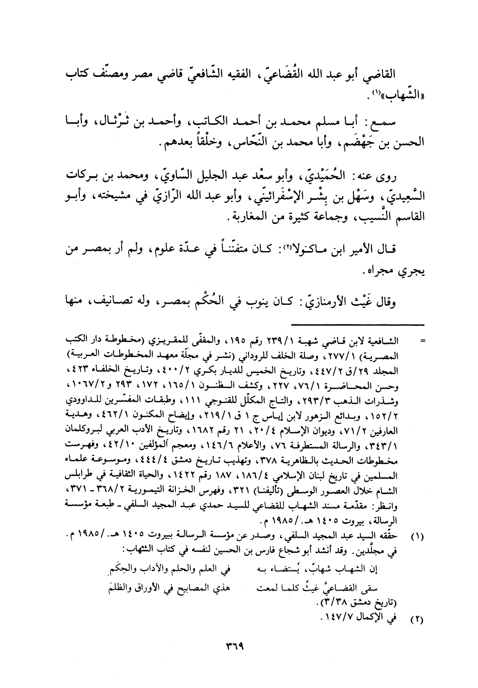 [ (-) ] الشافعية لابن قاضي شهبة 1/ 239 رقم 195، والمقفّى للمقريزي (مخطوطة دار الكتب المصرية) 1/ 277، وصلة الخلف للروداني (نشر في مجلّة معهد المخطوطات العربية) المجلد 29/ ق 2/ 447، وتاريخ الخميس للدياربكري 2/ 400، وتاريخ الخلفاء 423، وحسن المحاضرة 1/ 76، 227، وكشف الظنون 1/ 165، 172، 293 و 2/ 1067، وشذرات الذهب 3/ 293، والتاج المكلّل للقنوجي 111، وطبقات المفسّرين للداوديّ 2/ 152، وبدائع الزهور لابن إياس ج 1 ق 1/ 219، وإيضاح المكنون 1/ 462، وهدية العارفين 2/ 71، وديوان الإسلام 4/ 20، 21 رقم 1682، وتاريخ الأدب العربيّ لبروكلمان 1/ 343، والرسالة المستطرفة 76، والأعلام 6/ 146، ومعجم المؤلفين 10/ 42، وفهرست مخطوطات الحديث بالظاهرية 378، وتهذيب تاريخ دمشق 4/ 444، وموسوعة علماء المسلمين في تاريخ لبنان الإسلامي 4/ 186، 187 رقم 1422، والحياة الثقافية في طرابلس الشام خلال العصور الوسطى (تأليفنا) 321، وفهرس الخزانة التيمورية 2/ 368- 371، وانظر: مقدّمة مسند الشهاب للقضاعي للسيد حمدي عبد المجيد السلفي- طبعة مؤسسة الرسالة، بيروت 1405 هـ. / 1985 م.