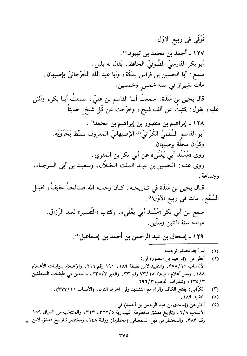 الأنساب 8/ 6، وتاريخ دمشق مخطوطة التيمورية 5/ 322، 323، والمنتخب من السياق 159 رقم 383، والمختار من ذيل السمعاني (مخطوط) ورقة 148، ومختصر تاريخ دمشق لابن-