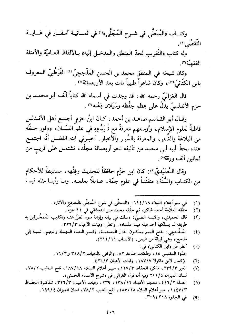 [7] العبر 3/ 239، تذكرة الحفاظ 3/ 117، سير أعلام النبلاء 18/ 187، نفح الطيب 2/ 78، لسان الميزان 4/ 201 وفيه أن قول الغزالي في «شرح الأسماء الحسنى» .