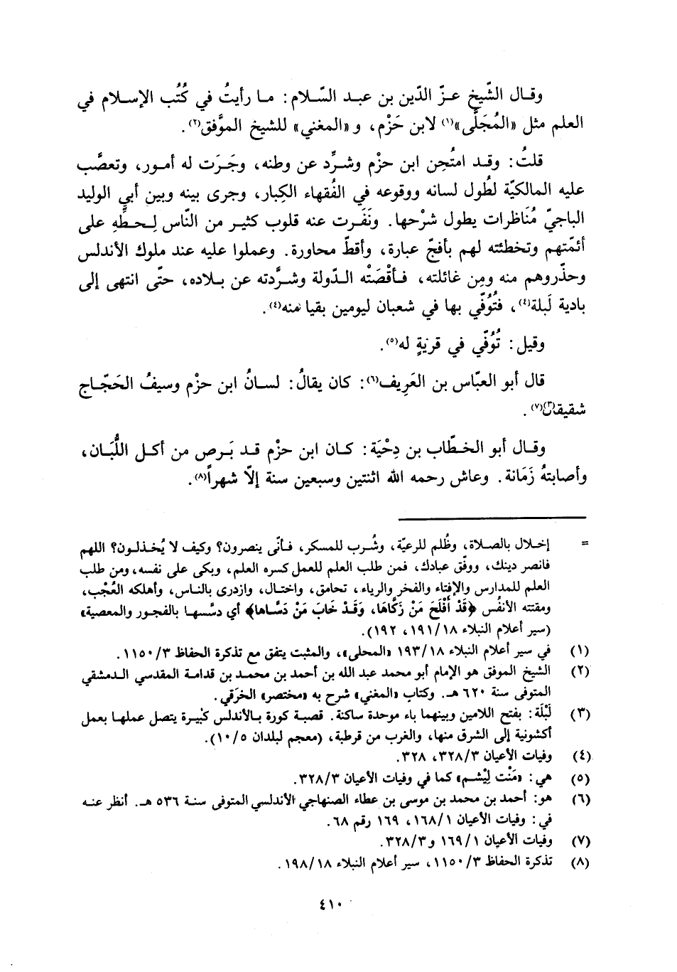 وقال الشّيخ عزّ الدّين بن عبد السَّلام: ما رأيتُ في كُتُب الْإِسلام في العِلم مثل «المجلّى» [1] لابن حزم، و «المغني» للشّيخ الموفَّق [2] .