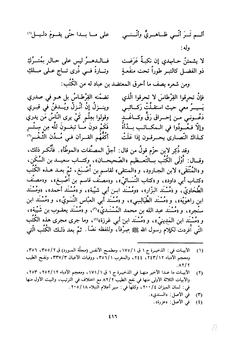 [2] الأبيات ما عدا الأخير منها في الذخيرة ج 1 ق 1/ 171، ومعجم الأدباء 12/ 252، 253، والأبيات الثلاثة الأولى منها في نفح الطيب 2/ 82 مع اختلاف في الترتيب، والبيت الأول منها في: لسان الميزان 4/ 200، وكلها في: سير أعلام النبلاء 18/ 205.