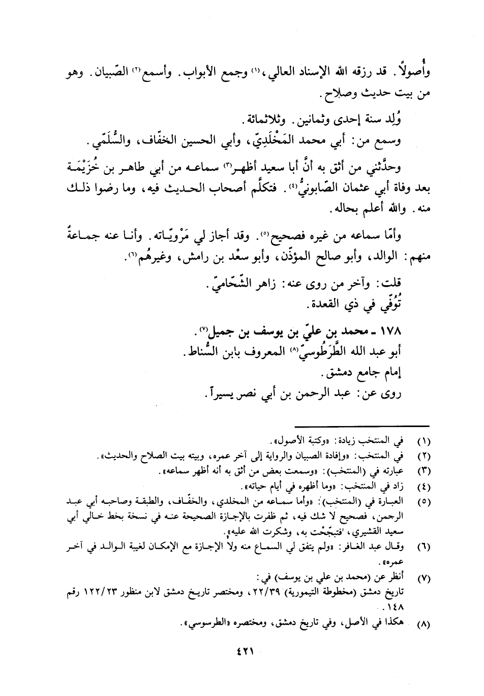 [5] العبارة في (المنتخب) : «وأما سماعه من المخلدي، والخفّاف، والطبقة وصاحبه أبي عبد الرحمن، فصحيح لا شك فيه، ثم ظفرت بالإجازة الصحيحة عنه في نسخة بخط خالي أبي سعيد القشيري، فتبجّحت به، وشكرت الله عليه» .