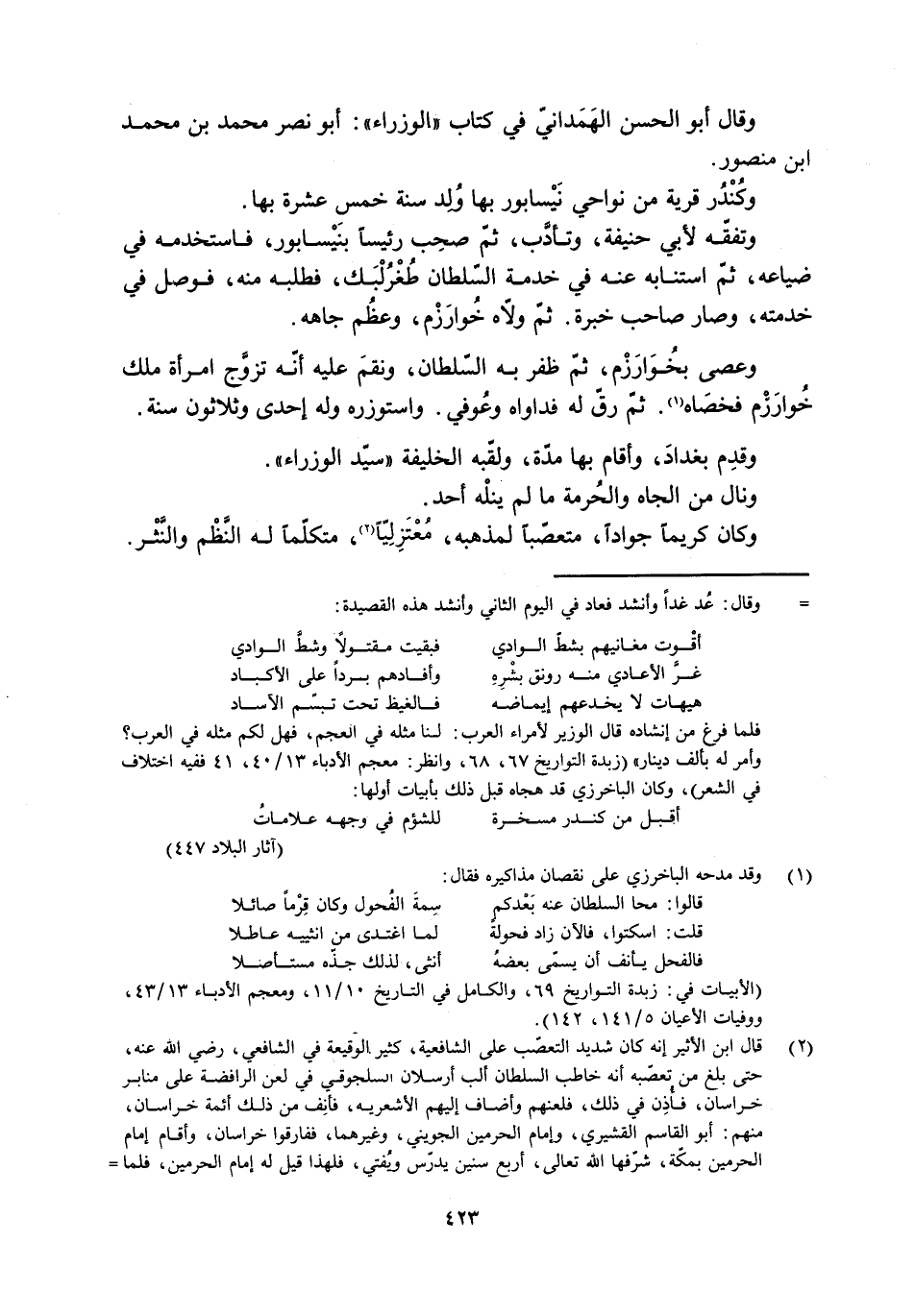(الأبيات في: زبدة التواريخ 69، والكامل في التاريخ 10/ 11، ومعجم الأدباء 13/ 43، ووفيات الأعيان 5/ 141، 142) .