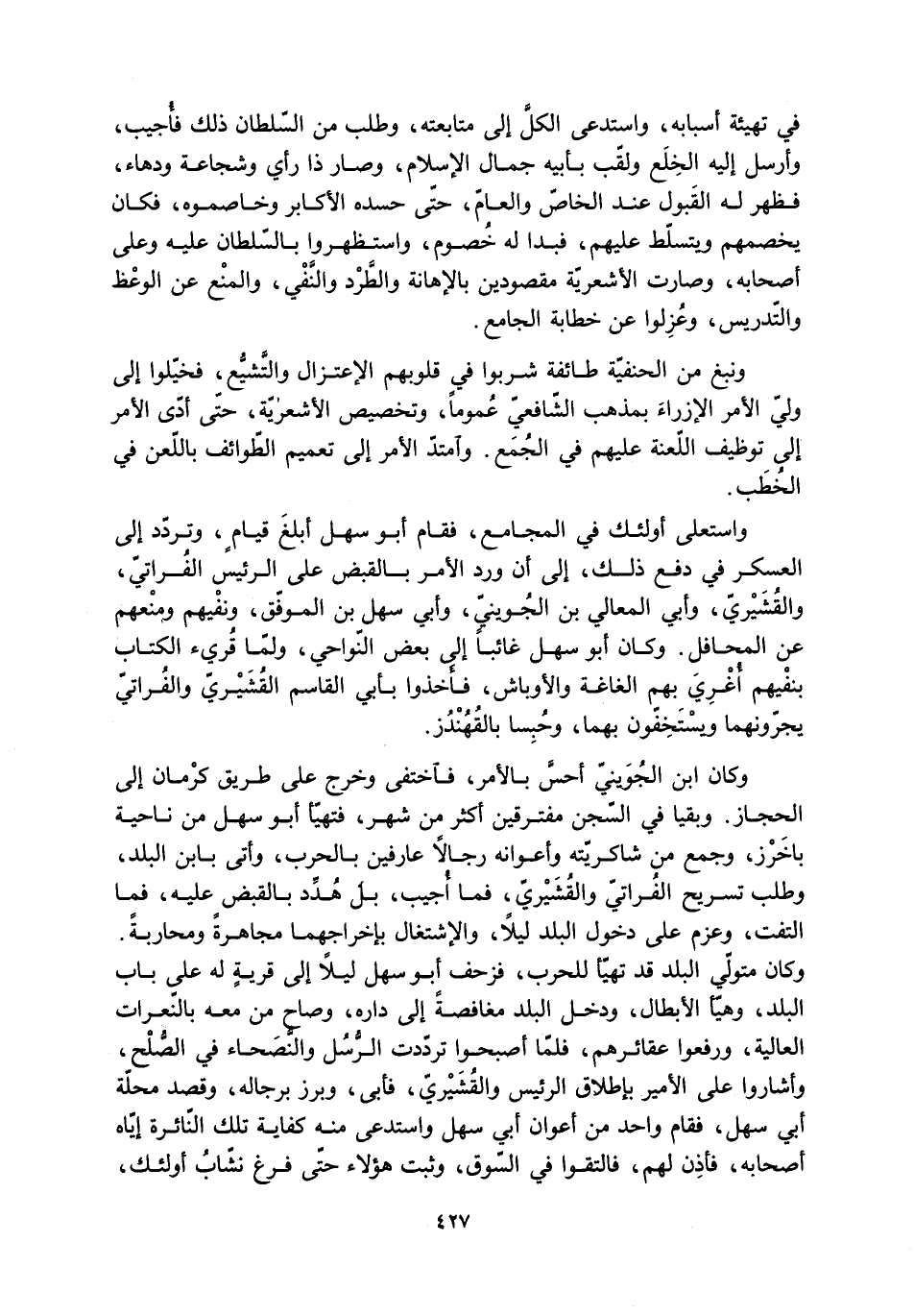 واستعلى أولئك في المجامع، فقام أبو سهل أبلغ قيام، وتردّدَ إلى العسكر في دفع ذلك، إلى أن ورد الأمر بالقبض على الرّئيس الفُرَاتيّ، والقُشَيْرِيّ، وأبي المعالي بن الْجُوَيْنيّ، وأبي سهل بن الموفّق، ونَفْيهم ومَنْعهم عن المحافل. وكان أبو سهل غائبًا إلى بعض النَّواحي، ولمَّا قُرئ الكِتاب بنفيهم أُغْرِيَ بهم الغاغة والَأوباش، فأخذوا بأبي القاسم القُشَيْريّ والفُراتيّ يجُرونهُما ويستَخِفّون بهما، وحبسا بالقهندز.