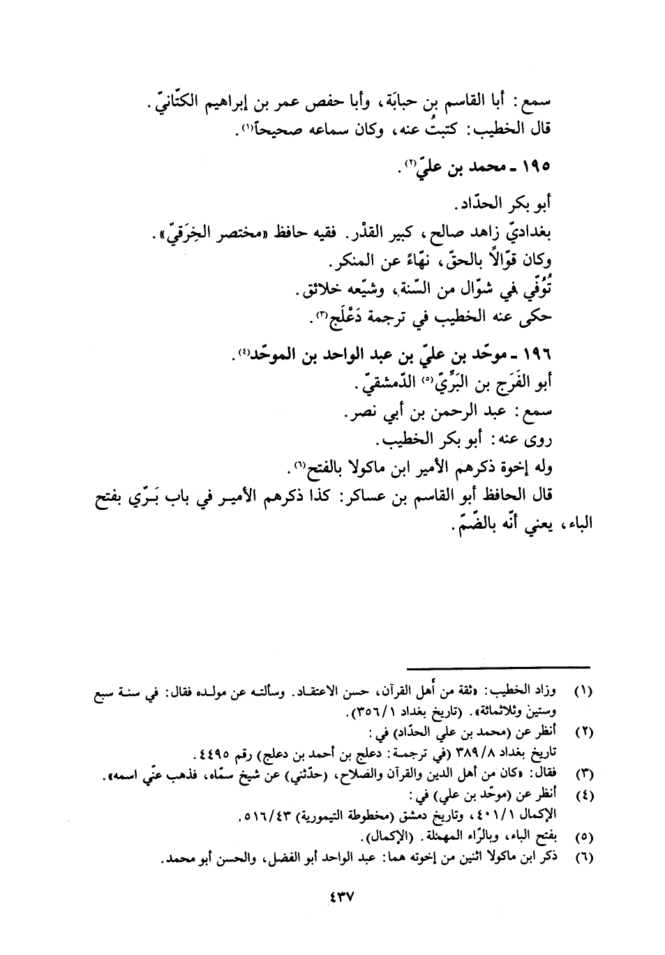 [1] وزاد الخطيب: «ثقة من أهل القرآن، حسن الاعتقاد. وسألته عن مولده فقال: في سنة سبع وستين وثلاثمائة» . (تاريخ بغداد 1/ 356) .