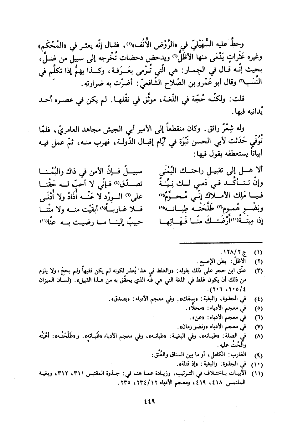 [11] الأبيات باختلاف في الترتيب، وزيادة عما هنا في: جذوة المقتبس 311، 312، وبغية الملتمس 418، 419، ومعجم الأدباء 12/ 234، 235.