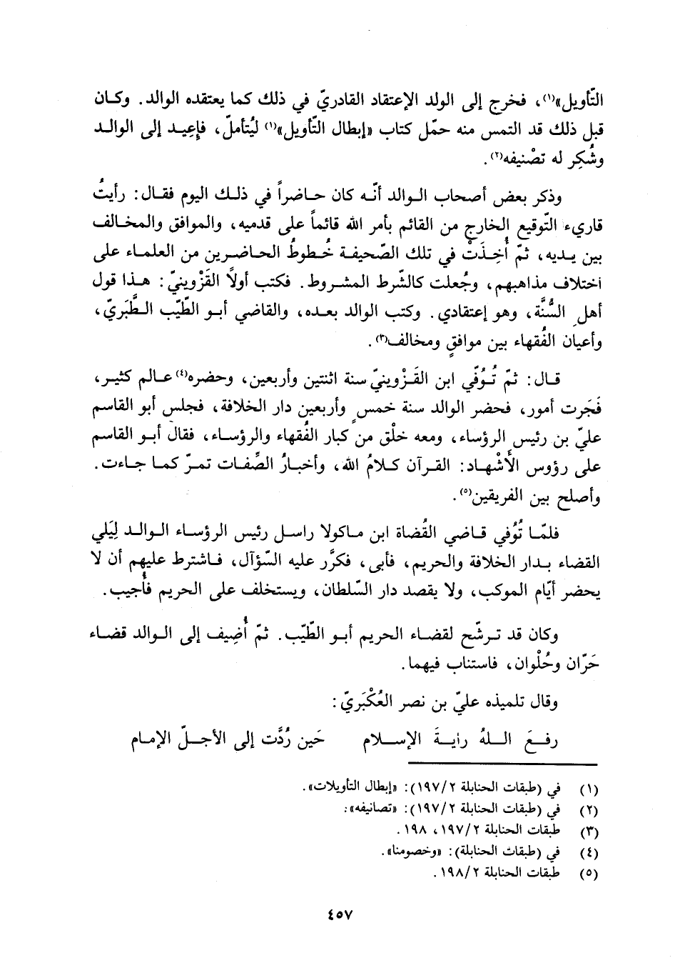 التأويل» [1] ، فخرج إلى الولد الاعتقاد القادريّ في ذلك كما يعتقده الوالد. وكان قبل ذلك قد التمس منه حمّل كتاب «إبطال التأويل» [1] ليُتَأمَّل، فأُعيد إلى الوالد وشُكِر لهُ تصنيفه [2] .