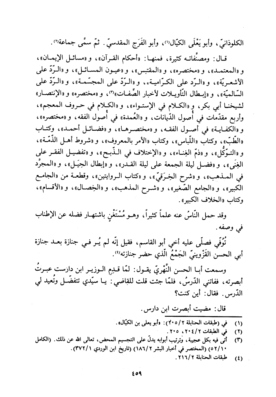 قال: ومصنَّفاته كثيرة، فمنها: «أحكام القرآن» ، و «مسائل الإيمان» ، و «المعتمد» ، و «مختصره» ، و «المقتبس» ، و «عيون المسائل» ، و «الرّدّ على الأشعريّة» ، و «الرّد على الكرّامية» ، و «الرّدّ على المجسّمة» ، و «الرّدّ على السّالميّة» ، و «إبطال التّأويلات لأخبار الصّفات» [3] ، و «مختصره» و «الإنتصار» لشيخنا أبي بكر، و «الكلام في الاستواء» ، و «الكلام في حروف المعجم» ، وأربع مُقدّمات في أصول الدّيانات، و «العمدة» في أصول الفقه، و «مختصره» ، و «الكفاية» في أصول الفقه، و «مختصرها» ، و «فضائل أَحْمَد» ، وكتاب «الطِّبّ» ، وكتاب «اللبّاس» ، وكتاب «الأمر بالمعروف» ، و «شروط أهل الذّمّة» ، و «التّوكّل» ، و «ذمّ الغناء» ، و «الاختلاف في الذّبح» ، و «تفضيل الفقر على الغنى» ، و «فضل ليلة الجمعة على ليلة القدر» ، و «إبطال الحيل» ، و «المجرّد في المذهب» ، و «شرح الخرقيّ» ، و «كتاب الروايتين» ، وقطعة من «الجامع الكبير» ، و «الجامع الصّغير» ، و «شرح المذهب» ، و «الخصال» ، و «الأقسام» ، وكتاب «الخلاف الكبير» .