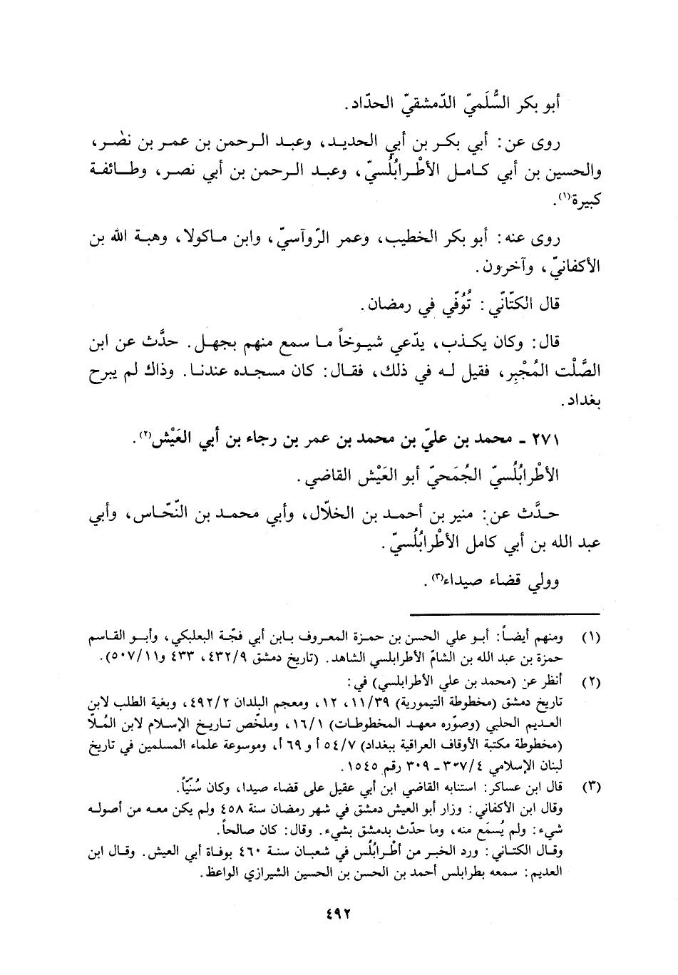 [1] ومنهم أيضا: أبو علي الحسن بن حمزة المعروف بابن أبي فجّة البعلبكي، وأبو القاسم حمزة بن عبد الله بن الشامّ الأطرابلسي الشاهد. (تاريخ دمشق 9/ 432، 433 و 11/ 507) .