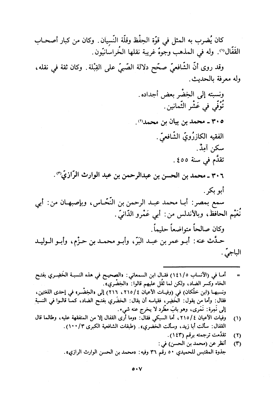 [1] وفيات الأعيان 4/ 215، أما السبكي فقال: «وما أرى القفال إلا من المتفقهة عليه، وطالما قال القفال: سألت أبا زيد، وسألت الخضري» . (طبقات الشافعية الكبرى 3/ 100) .