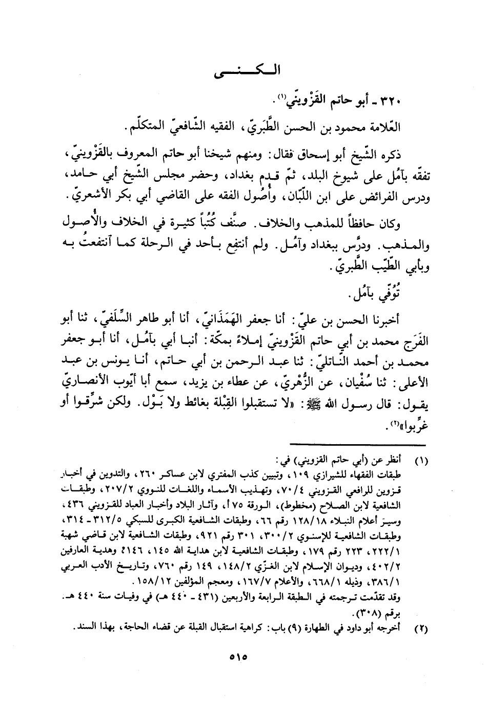 ذكره الشِّيخ أبو إسحاق فقال: ومنهم شيخنا أبو حاتم المعروف بالقَزْوِينيّ، تفقّه بآمل على شيوخ البلد، ثم قدِم بغداد، وحضر مجلس الشّيخ أبي حامد، ودرس الفرائض على ابن اللّبّان، وأصول الفقه على القاضي أبي بكر الأشعريّ.