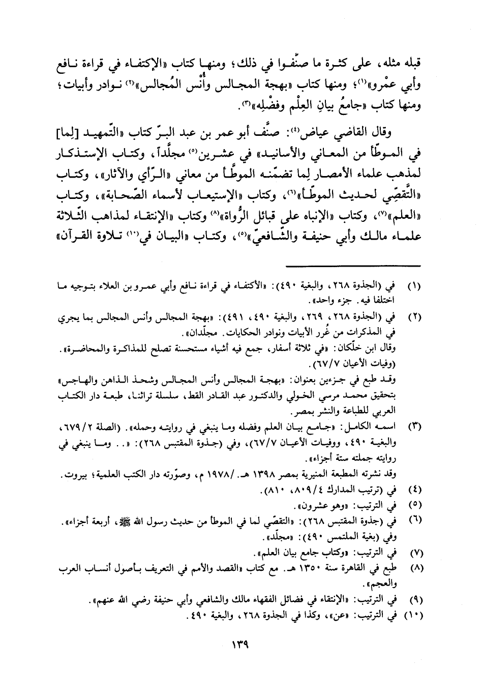 وقال القاضي عياض [4] : صنَّف أبو عمر بن عبد البر كتاب «التمهيد [لما] فِي الموطأ من المعاني والأسانيد» فِي عشرين [5] مجلَّدًا، وكتاب الاستذكار لمذهب علماء الأمصار لما تضمنه الموطأ من معاني «الرّأي والآثار» ، وكتاب «التّقصّي لحديث الموطّأ» [6] ، وكتاب «الإستيعاب لأسماء الصّحابة» ، وكتاب «العلم» [7] ، وكتاب «الإنباه على قبائل الرُّواة» [8] وكتاب «الانتقاء لمذاهب الثلاثة علماء مالك وأبي حنيفة والشافعي» [9] ، وكتاب «البيان فِي [10] تلاوة القرآن»