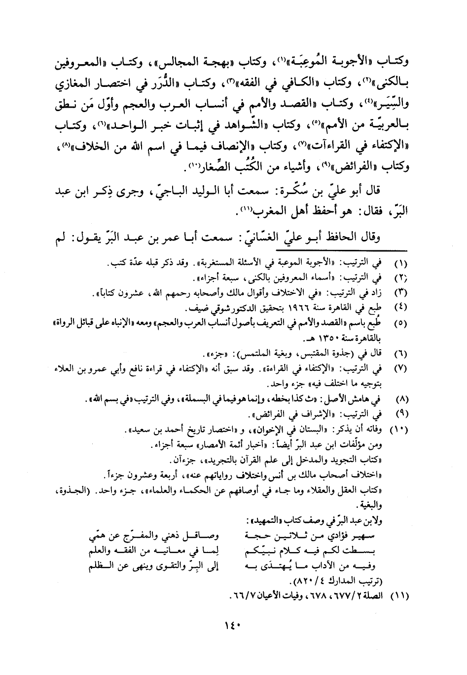 وكتاب «الأجوبة المُوعِبَة» [1] ، وكتاب «بهجة المجالس» ، وكتاب «المعروفين بالكنى» [2] ، وكتاب «الكافي فِي الفقه» [3] ، وكتاب «الدُّرَر فِي اختصار المغازي والسِّيَر» [4] ، وكتاب «القصد والأمم فِي أنساب العرب والعجم وأول من نطق بالعربية من الأمم» [5] ، وكتاب «الشواهد فِي إثبات خبر الواحد» [6] ، وكتاب «الاكتفاء في القراءات» [7] ، وكتاب «الإنصاف فيما في اسم الله من الخلاف» [8] ، وكتاب «الفرائض» [9] ، وأشياء من الكتب الصغار [10] .