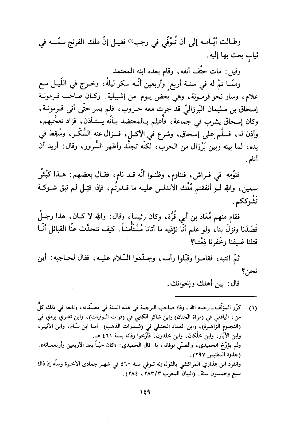 [1] كرّر المؤلّف- رحمه الله- وفاة صاحب الترجمة في هذه السنة في مصنّفاته، وتابعه في ذلك كلّ من: اليافعي في (مرآة الجنان) وابن شاكر الكتبي في (فوات الوفيات) ، وابن تغري بردي في (النجوم الزاهرة) ، وابن العماد الحنبلي في (شذرات الذهب) . أما ابن بسّام، وابن الأثير، وابن الأبّار، وابن خلّكان، وابن خلدون، فأرّخوا وفاته بسنة 461 هـ-.