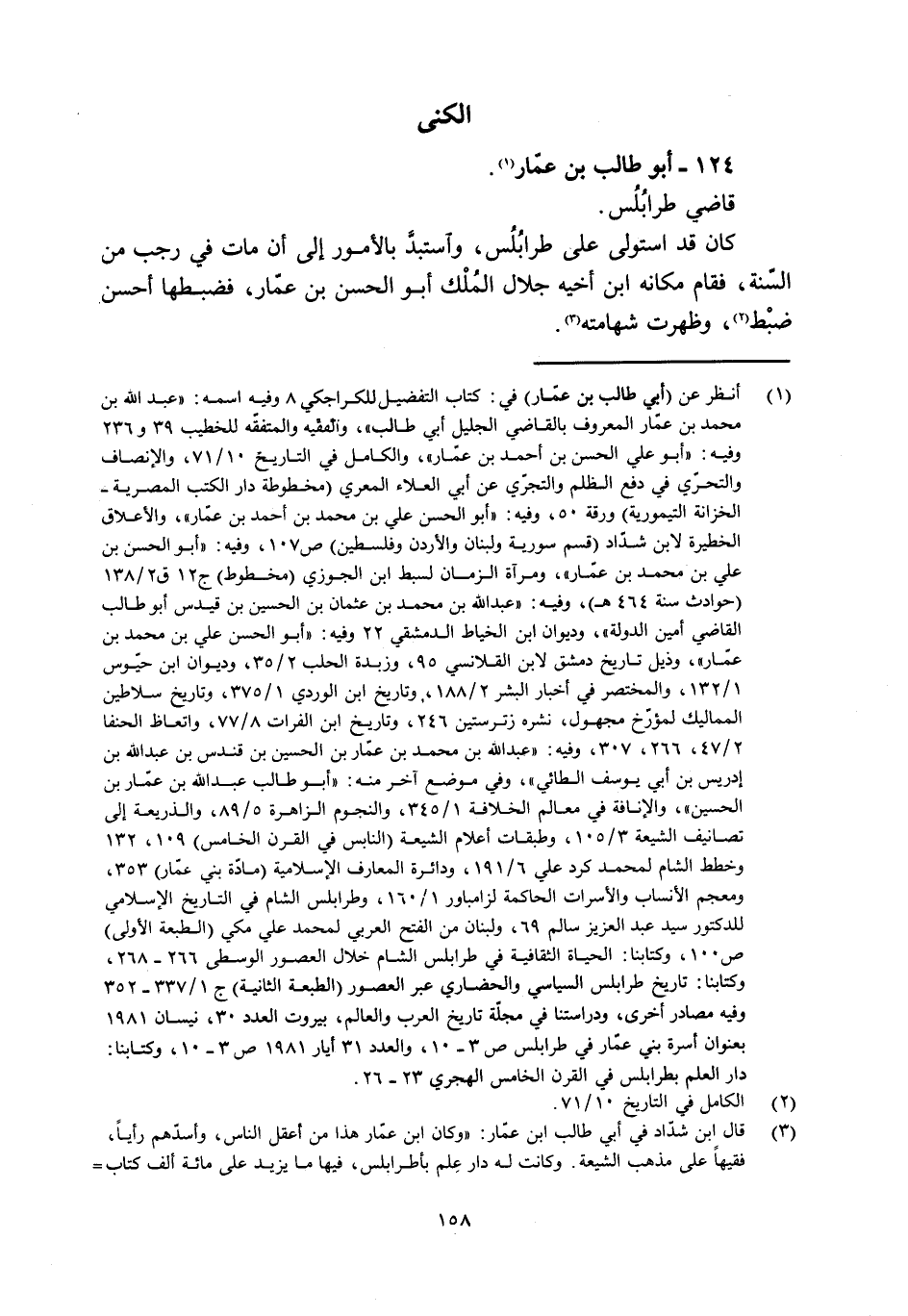 [1] انظر عن (أبي طالب بن عمّار) في: كتاب التفضيل للكراجكي 8 وفيه اسمه: «عبد الله بن محمد بن عمّار المعروف بالقاضي الجليل أبي طالب» ، والفقيه والمتفقّه للخطيب 39 و 236 وفيه: «أبو علي الحسن بن أحمد بن عمّار» ، والكامل في التاريخ 10/ 71، والإنصاف والتحرّي في دفع الظلم والتجرّي عن أبي العلاء المعري (مخطوطة دار الكتب المصرية- الخزانة التيمورية) ورقة 50، وفيه: «أبو الحسن علي بن محمد بن أحمد بن عمّار» ، والأعلاق الخطيرة لابن شدّاد (قسم سورية ولبنان والأردن وفلسطين) ص 107، وفيه: «أبو الحسن بن علي بن محمد بن عمّار» ، ومرآة الزمان لسبط ابن الجوزي (مخطوط) ج 12 ق 2/ 138 (حوادث سنة 464 هـ-) ، وفيه: «عبد الله بن محمد بن عثمان بن الحسين بن قيدس أبو طالب القاضي أمين الدولة» ، وديوان ابن الخياط الدمشقيّ 22 وفيه: «أبو الحسن علي بن محمد بن عمّار» ، وذيل تاريخ دمشق لابن القلانسي 95، وزبدة الحلب 2/ 35، وديوان ابن حيّوس 1/ 132، والمختصر في أخبار البشر 2/ 188، وتاريخ ابن الوردي 1/ 375، وتاريخ سلاطين المماليك لمؤرّخ مجهول، نشره زترستين 246، وتاريخ ابن الفرات 8/ 77، واتعاظ الحنفا 2/ 47، 266، 307، وفيه: «عبد الله بن محمد بن عمّار بن الحسين بن قندس بن عبد الله بن إدريس بن أبي يوسف الطائي» ، وفي موضع آخر منه: «أبو طالب عبد الله بن عمّار بن الحسين» ، والإنافة في معالم الخلافة 1/ 345، والنجوم الزاهرة 5/ 89، والذريعة إلى تصانيف الشيعة 3/ 105، وطبقات أعلام الشيعة (النابس في القرن الخامس) 109، 132 وخطط الشام لمحمد كردعلي 6/ 191، ودائرة المعارف الإسلامية (مادّة بني عمّار) 353، ومعجم الأنساب والأسرات الحاكمة لزامباور 1/ 160، وطرابلس الشام في التاريخ الإسلامي للدكتور سيد عبد العزيز سالم 69، ولبنان من الفتح العربيّ لمحمد علي مكي (الطبعة الأولى) ص 100، وكتابنا: الحياة الثقافية في طرابلس الشام خلال العصور الوسطى 266- 268، وكتابنا: تاريخ طرابلس السياسي والحضاريّ عبر العصور (الطبعة الثانية) ج 1/ 337- 352 وفيه مصادر أخرى، ودراستنا في مجلّة تاريخ العرب والعالم، بيروت العدد 30، نيسان 1981 بعنوان أسرة بني عمّار في طرابلس ص 3- 10، والعدد 31 أيار 1981 ص 3- 10، وكتابنا: