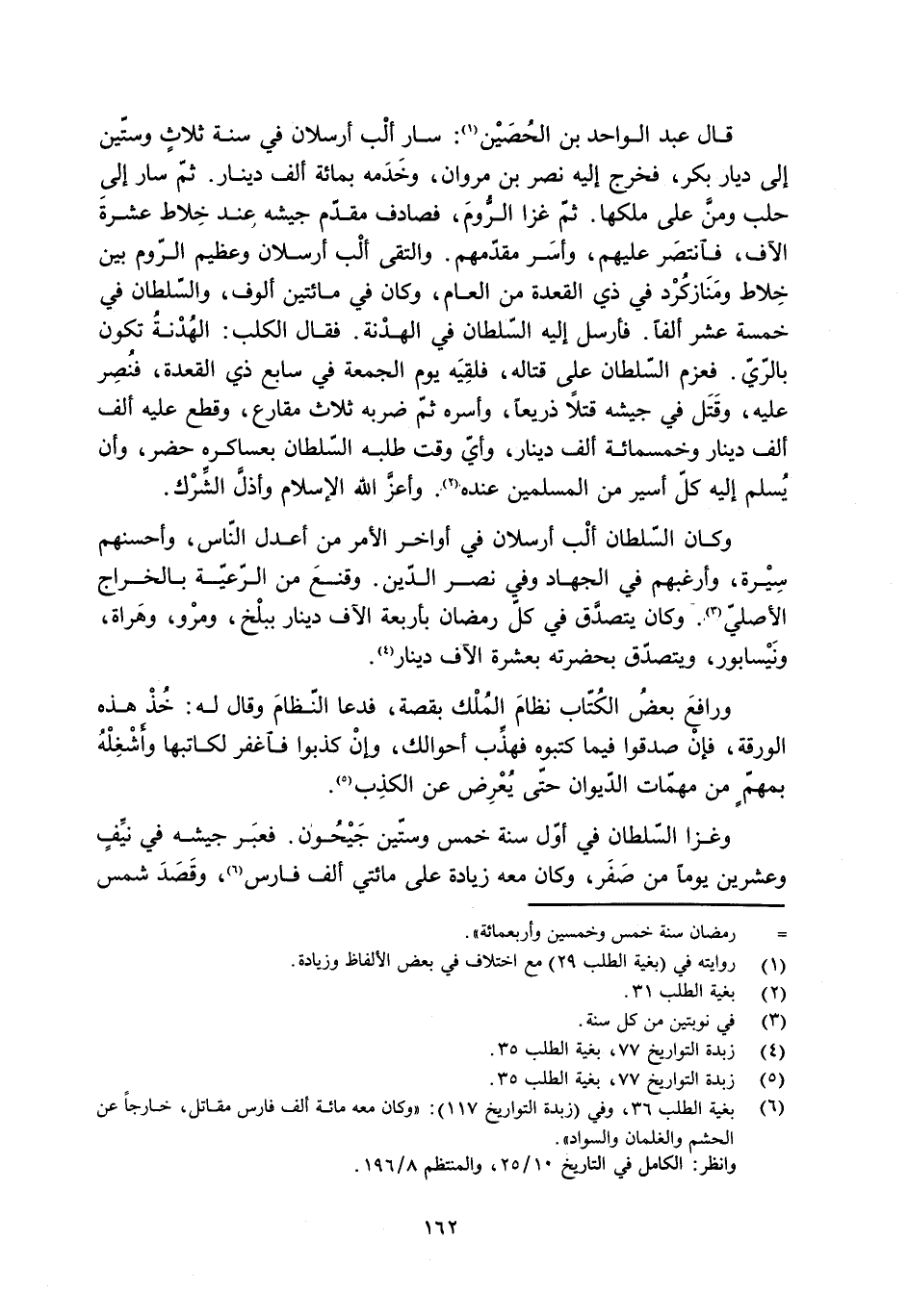 [6] بغية الطلب 36، وفي (زبدة التواريخ 117) : «وكان معه مائة ألف فارس مقاتل، خارجا عن الحشم والغلمان والسواد» .