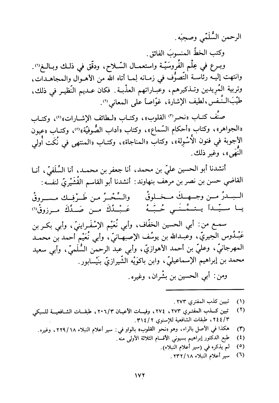 أنشدنا أبو الْحُسَيْن عليّ بْن مُحَمَّد، أَنَا جَعْفَر بْن مُحَمَّد، أَنَا السِّلَفيّ، أَنَا القاضي حسن بْن نصر بْن مرهف بنهاوند: أنشدنا أبو القاسم القُشَيْريّ لنفسه: