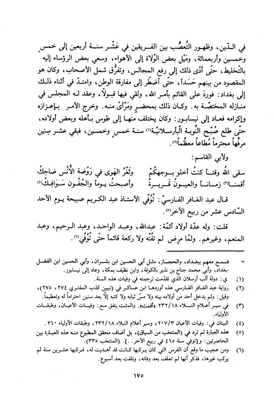 [5] هذه العبارة لم ترد في (المنتخب من السياق) ، بل أضاف محقق المطبوع منه هذه العبارة بين الحاصرتين: و [توفي سنة 465 في ربيع الآخر..] . (المنتخب 335) .