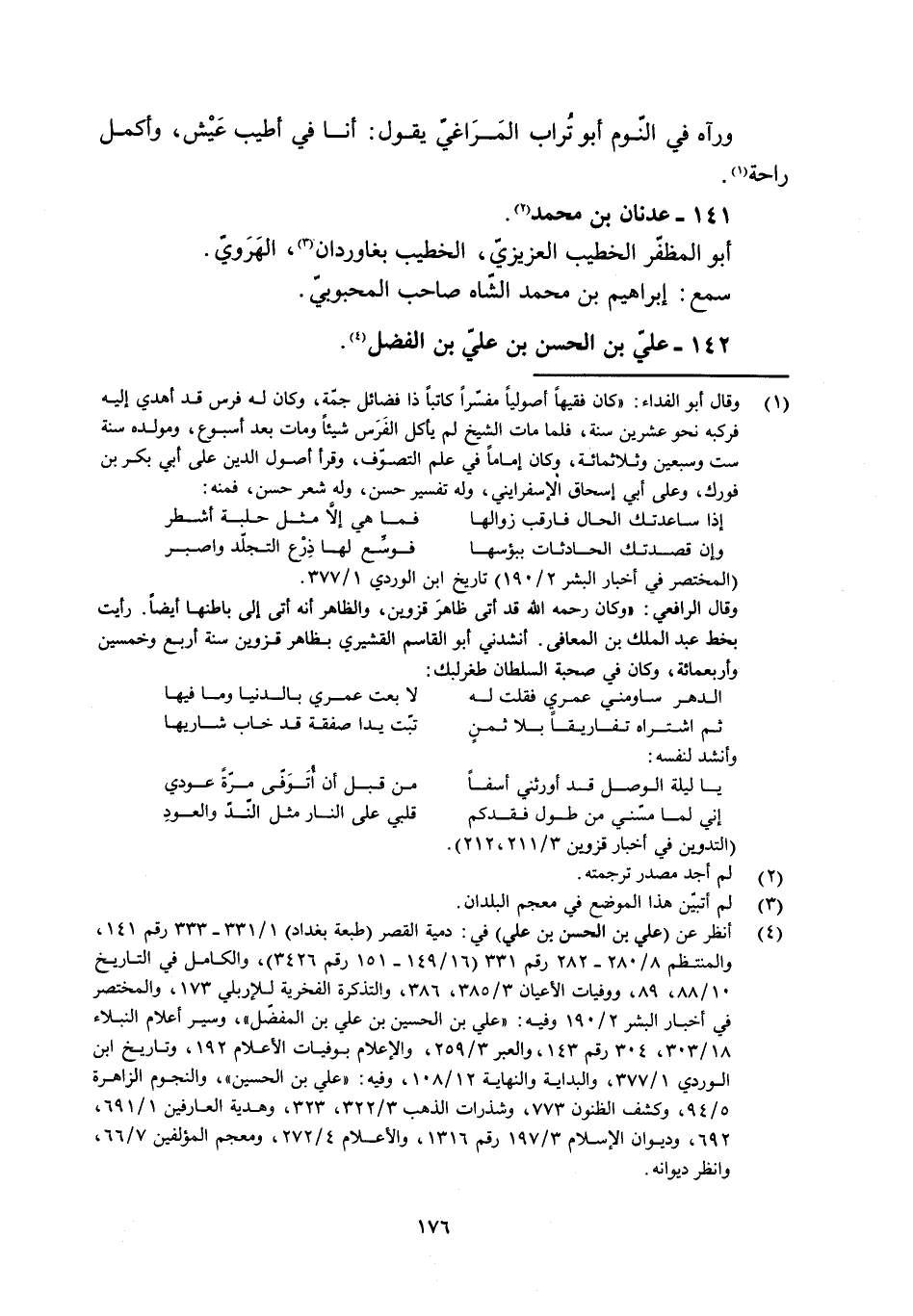[4] انظر عن (علي بن الحسن بن علي) في: دمية القصر (طبعة بغداد) 1/ 331- 333 رقم 141، والمنتظم 8/ 280- 282 رقم 331 (16/ 149- 151 رقم 3426) ، والكامل في التاريخ 10/ 88، 89، ووفيات الأعيان 3/ 385، 386، والتذكرة الفخرية للإربلي 173، والمختصر في أخبار البشر 2/ 190 وفيه: «علي بن الحسين بن علي بن المفضّل» ، وسير أعلام النبلاء 18/ 303، 304 رقم 143، والعبر 3/ 259، والإعلام بوفيات الأعلام 192، وتاريخ ابن الوردي 1/ 377، والبداية والنهاية 12/ 108، وفيه: «علي بن الحسين» ، والنجوم الزاهرة 5/ 94، وكشف الظنون 773، وشذرات الذهب 3/ 322، 323، وهدية العارفين 1/ 691، 692، وديوان الإسلام 3/ 197 رقم 1316، والأعلام 4/ 272، ومعجم المؤلفين 7/ 66، وانظر ديوانه.
